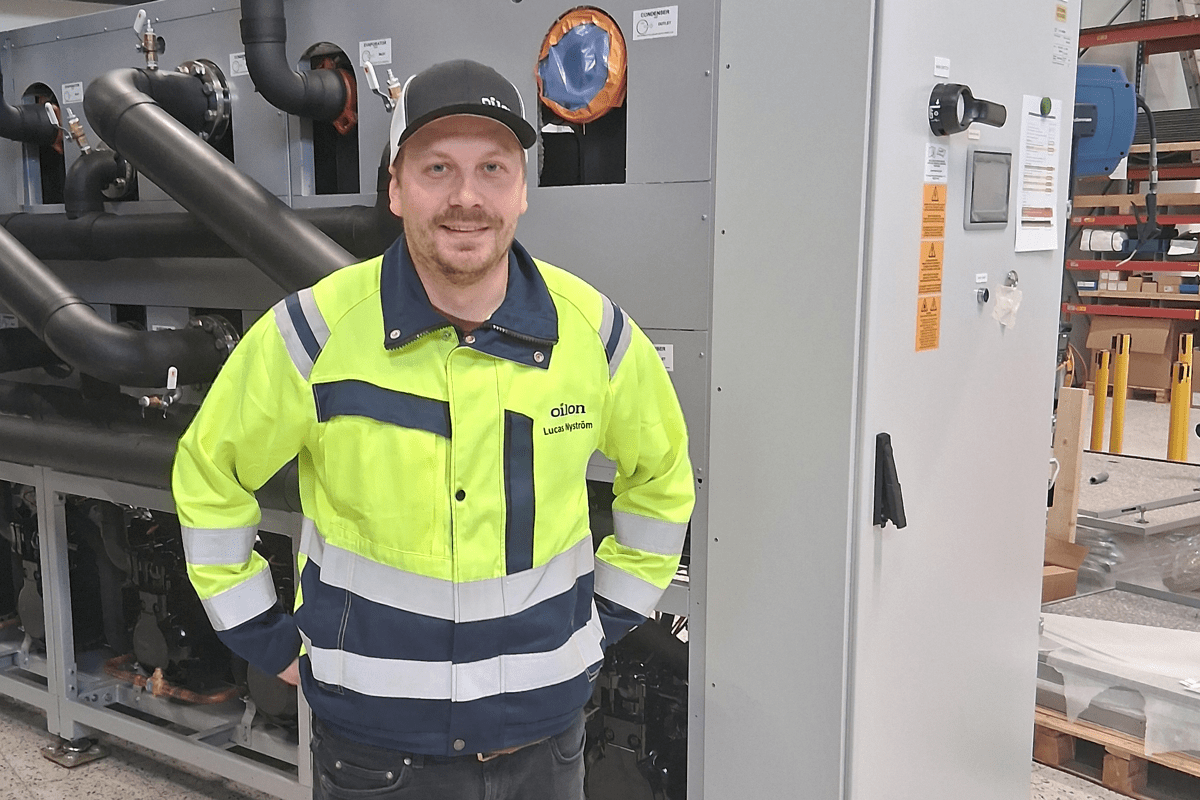 Lucas Nyström is one of the newer faces at Oilon, having joined the Kokkola factory as a Production Manager in August 2025. The Kokkola factory, where Oilon’s industrial heat pumps are manufactured, employs two Production Managers who lead a team of around forty production employees. In his role, Lucas is responsible for daily production management, monitoring schedules, and actively developing flow efficiency.